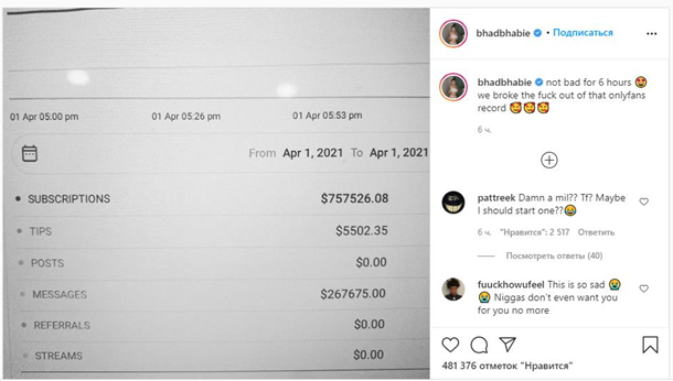 "Непогано для шести годин. Ми побили рекорд на OnlyFans", - поділилася Bhad Bhabie.