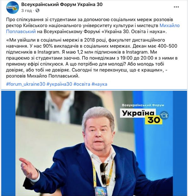 Ректор Київського національного університету культури і мистецтв Михайло Поплавський став спікером на Всеукраїнському форумі Україна 30. Освіта і наука, який триває в столиці з 31 травня по 2 червня.