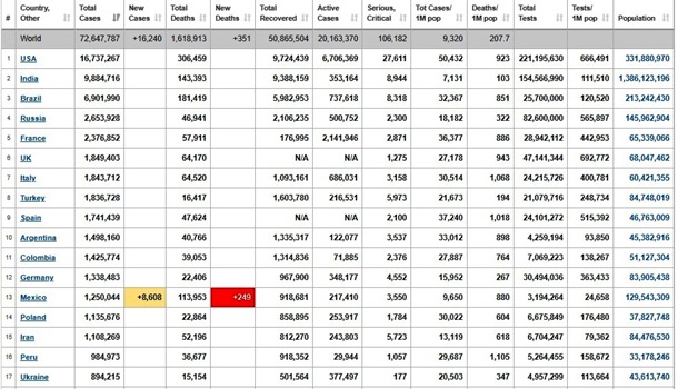 Сейчас в мире диагностировано 72 миллиона случаев инфицирования коронавирусом, 50 миллионов больных вылечились, 1 610 173 COVID-пациентов умерли.