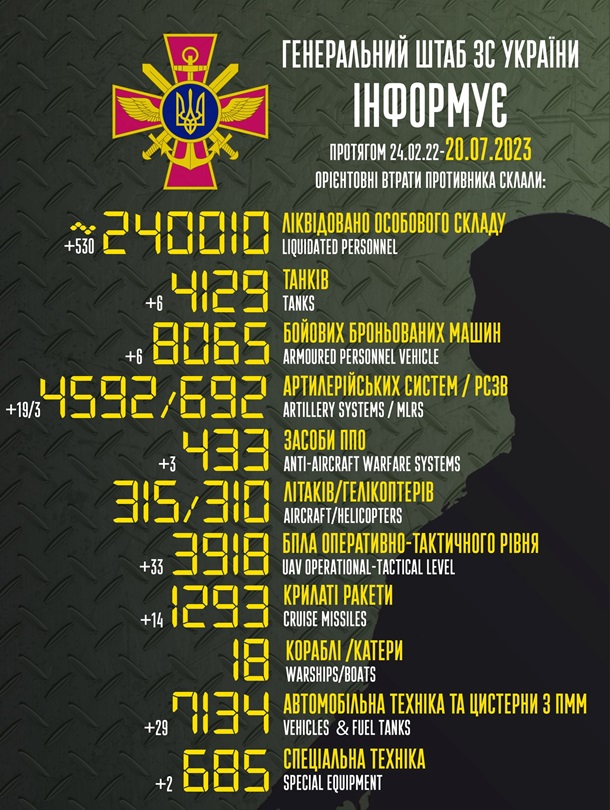 З 24 лютого 2022 року по 20 липня 2023 року загальні бойові втрати особового складу російських військ на території України орієнтовно склали 240 010 осіб (+530 за добу). Про це повідомив Генеральний штаб ЗСУ.