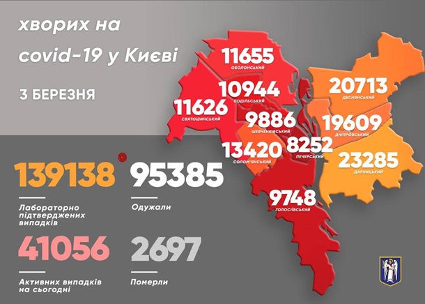 Всього за час пандемії в Києві коронавірус виявили у 139 138 осіб, з них 2 697 пацієнтів померли (+25 за добу), 95 385 осіб одужали (+789 за добу).