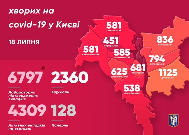 Всего в столице уже 6797 подтвержденных случаев заболевания COVID-19. Сначала пандемии выздоровели 2360 киевлян, скончались – 128.