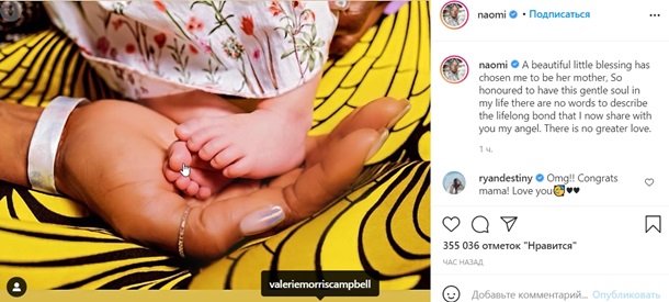 "Гарний маленький подарунок долі вибрав мене в якості своєї матері. Я так горда мати цю ніжну душу в своєму житті, немає слів, щоб описати той зв'язок на все життя, який я тепер поділяю з тобою, мій ангеле", - написала Кемпбелл в Instagram.
