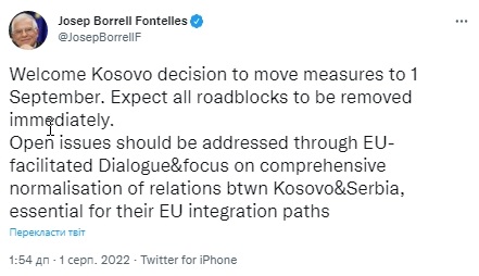 Верховний представник ЄС із закордонних справ та політики безпеки Жозеп Боррель привітав рішення уряду Косова відкласти план щодо зміни документів для сербів до 1 вересня. Відповідну заяву він опублікував у Twitter 1 серпня.