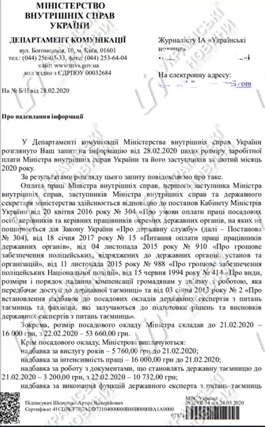 Зарплата первого заместителя министра Сергея Ярового составила 61914 гривен, заместителей Татьяны Ковальчук – 52125 гривен, Екатерины Павличенко – 55367 гривен, Сергея Гончарова – 59398 гривен, Антона Геращенко – 52926 гривен, Александра Гогилашвили – 51817 гривен, госсекретаря Алексея Тахтая – 98856 гривен.