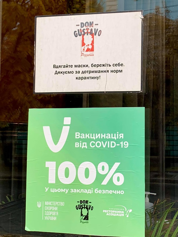 Перша відмітка вже з'явилася на дверях одного з ресторанів. Вона свідчить, що весь персонал закладу вакциновано від коронавірусу і заклад може продовжувати роботу навіть у "червоній" карантинній зоні.
