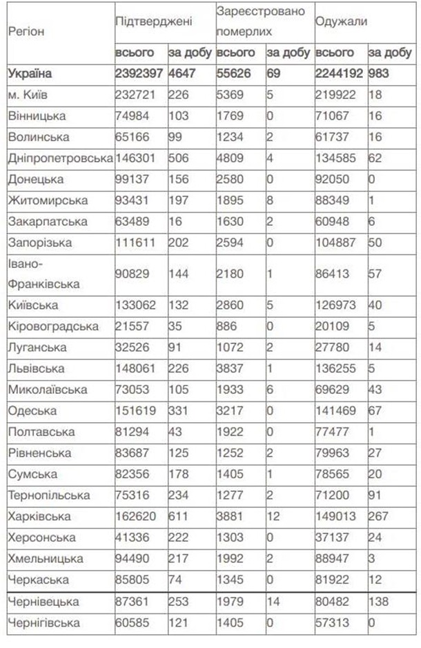 За весь час пандемії в Україні, за офіційними даними, захворіло вже 2 392 397 осіб, померли від ковіду 55 626 українців.