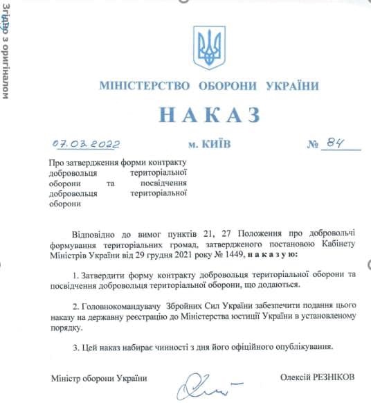 Зазначається, що наказ Міноборони від 7 березня №84 врегулював правовий статус добровольців. Кожен громадянин України, який підписав контракт, отримає посвідчення, статус та відповідні соціальні гарантії.