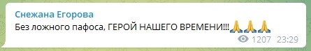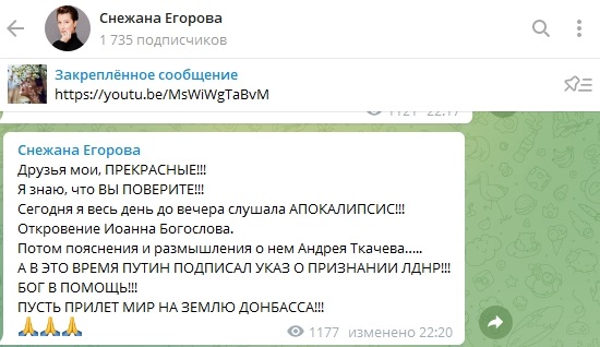 "Друзі мої, чудові! Я знаю, що ви повірите! Сьогодні я цілий день до вечора слухала апокаліпсис. Одкровення Івана Богослова. Потім пояснення та роздуми про нього Андрія Ткачова... А в цей час Путін підписав указ про визнання т.зв."Л/ДНР"! Бог на поміч! Хай настане мир на землях Донбасу!" – зауважила Єгорова.