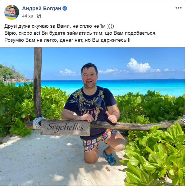 Бывший глава Офиса президента Андрей Богдан в понедельник, 17 февраля, опубликовал в Facebook свое фото с отдыха на Сейшельских островах.