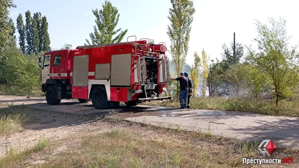 Крім того, біля будівлі перебуває транспорт пожежників, які гасить спалах трави.