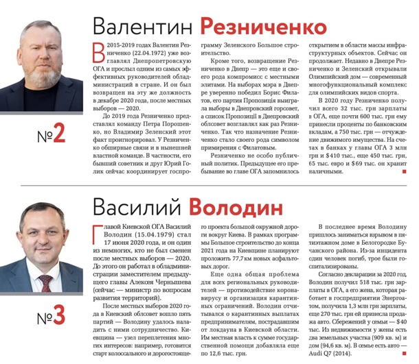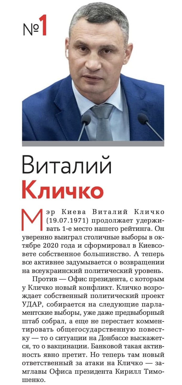 "Мер Києва Віталій Кличко продовжує утримувати 1-е місце нашого рейтингу. Він впевнено виграв столичні вибори в жовтні 2020 року і сформував у Київраді власну більшість. А тепер все активніше замислюється про повернення на всеукраїнський політичний рівень", - йдеться в статті.