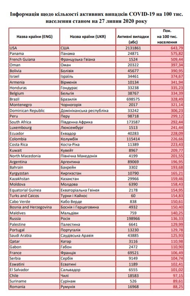 Информацию в Минздраве подготовили и опубликовали, опираясь на данные по количеству активных случаев COVID-19 на 100 тыс. населения по состоянию на 27 июля 2020 года.