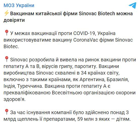 Скріншот повідомлення МОЗ України про вакцину Sinovac