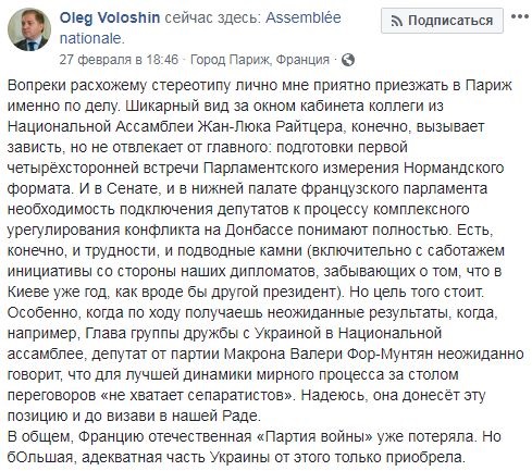 "Шикарный вид за окном кабинета коллеги из Национальной ассамблеи Жана-Люка Рейтцера, конечно, вызывает зависть, но не отвлекает от главного: подготовки первой четырехсторонней встречи парламентского измерения нормандского формата", - написал тогда Волошин.
