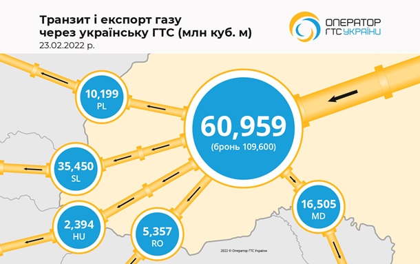 "Заявка на транзит газу через Україну в ЄС на 23 лютого становить 60,959 млн куб. м (+10 млн куб. м порівняно з попередньою газовою добою)", – йдеться у повідомленні.