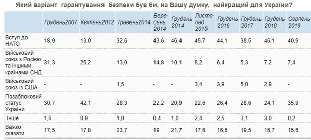 Вступление Украины в НАТО поддерживают 40,9%. В декабре 2018 года таких было 46,1%. За внеблоковый статус Украины высказались 35,9% опрошенных, в декабре 2018 таких было 24,1%.