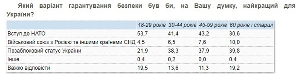 При этом больше сторонников у НАТО как гарантии безопасности для Украины в возрастной группе 18-29 лет (54%). Предпочитают внеблоковый статус только украинцы старше 60 лет, таких 40%.