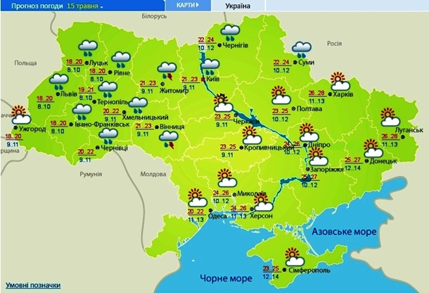 У суботу, 15 травня, без парасольки на вулицю не варто виходити жителям півночі і заходу України. У цих областях вдень повітря прогріється до +21 ... +23 градусів. Вночі на термометрах буде 9 ... 11 градусів зі знаком плюс. На сході, центрі та півдні країни - хмарно з проясненнями. Тут тепліше. Вдень очікується +24 ... +26°C, вночі +11 ... +13.