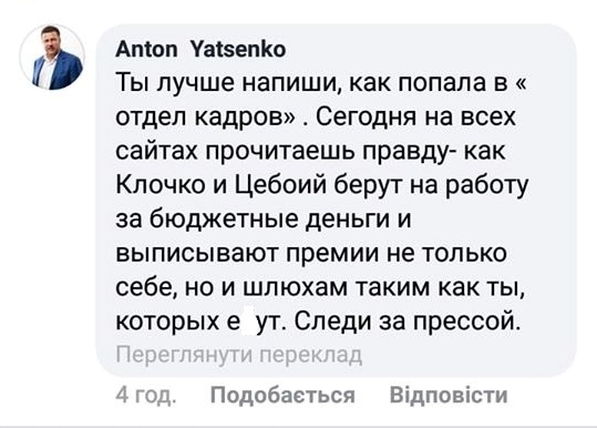 "Мы, женщины, работающие в органах местного самоуправления, считаем недостойным поведение народного депутата Антона Яценко. В своих карманных интернет-ресурсах он распространяет лживую информацию о женщинах-сотрудниках городского совета. Это прямое давление, в том числе по половому признаку", - написала она.