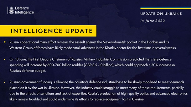 Метою РФ на Донбасі залишається наступ на Сєвєродонецьк, крім того, її військам вперше за кілька тижнів вдалося просунутися на Харківському напрямку. Про це йдеться у звіті Міноборони Великої Британії, опублікованому 14 червня.