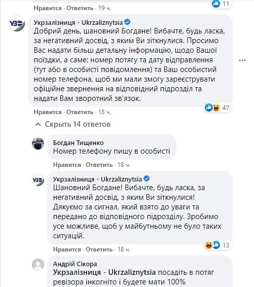"Просимо Вас надати більш детальну інформацію про вашу поїздку, а саме: номер поїзда і дату відправлення і ваш особистий номер телефону, щоб ми мали можливість зареєструвати офіційне звернення", - йдеться в повідомленні.