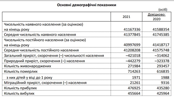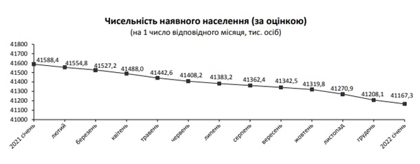 Зрештою, чисельність наявного населення в Україні на 1 січня 2022 року становила 41 167 336 осіб. З початку 2021 року населення України скоротилося на 421 018 осіб (зокрема за грудень – на 40 770 осіб).
