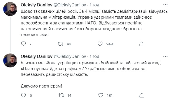 Україна активно переозброюється за стандартами НАТО, і вже близько мільйона українців набувають бойового та військового досвіду. Про це 6 липня написав у Twitter секретар Ради національної безпеки та оборони (РНБО) Олексій Данілов.