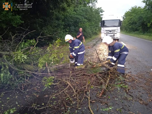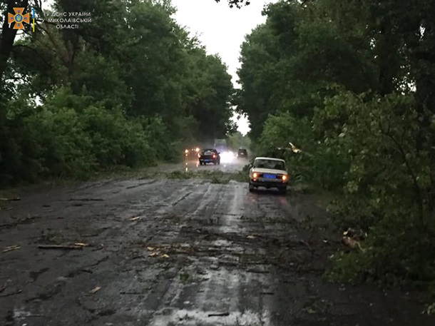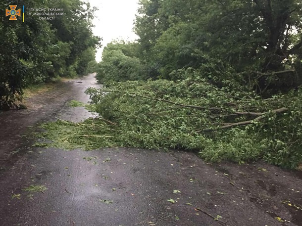 Через сильні пориви вітру і зливи падали дерева, які перекрили автодорогу Н-24 Благовіщенське - Миколаїв у декількох місцях.