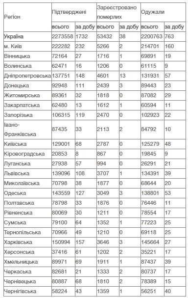 За весь час пандемії в Україні коронавірус виявили у 2 273 558 осіб, з них одужали 2 200 763 особи і 53 432 особи померли.