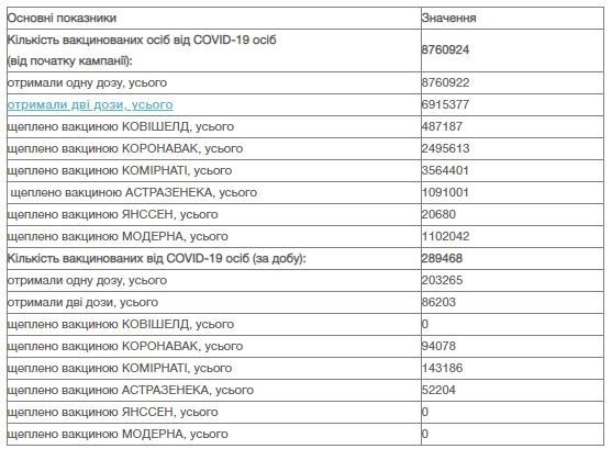 Усього однією дозою щеплено 8 760 922 особи, повністю імунізовані і отримали дві дози - 6 915 377 осіб. Всього проведено 15 676 299 щеплень.
