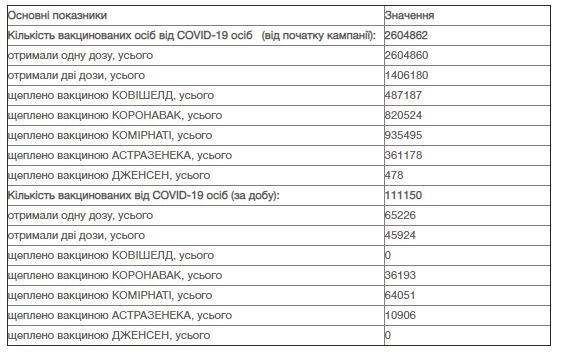Так, за минулу добу вакциновано 111 150 осіб. Одну дозу отримали 65 226 людей, повністю імунізовані - 45 924 особи.