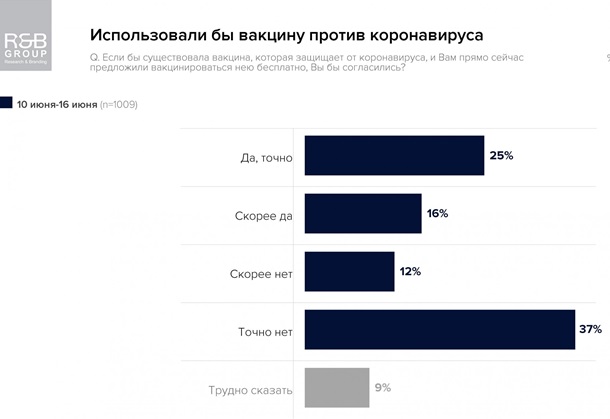 При этом 25% точно готовы воспользоваться вакциной, а 16% - скорее всего готовы. Однако не делали бы вакцинации 49% респондентов (37% точно и 12% скорее всего).