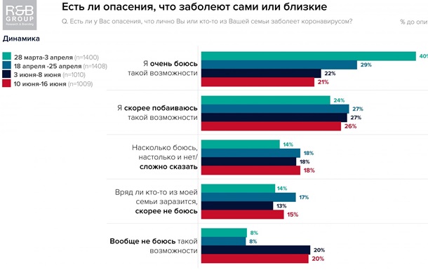 Также остается стабильным и процент тех, кто скорее не боится возможности заболеть COVID-19 (15%). Кроме того, с начала июня отмечается существенное увеличение числа тех, кто вообще не боится заболеть коронавирусом (20% в июне против 8% в апреле).