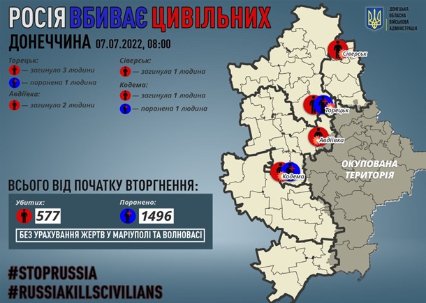 Усього з початку воєнного вторгнення РФ у Донецькій області загинули 577 цивільних, і ще щонайменше 1496 отримали поранення.