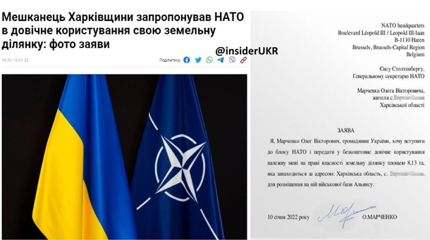 "Чоловік висловив бажання особисто вступити до Альянсу та пропонує віддати свою земельну ділянку 8,13 га на території Харківської області для бази НАТО абсолютно безкоштовно", - пише Telegram-канал.