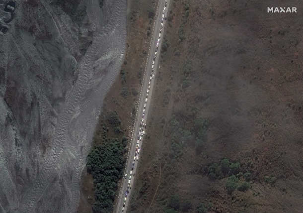 "Супутникові знімки від 25 вересня 2022 року показують великий затор транспортних засобів, які виїжджають із Росії та намагаються перетнути грузинський кордон на КПП Верхній Ларс після указу президента РФ Путіна про мобілізацію на війну в Україну", - заявили в Maxar Technologies.