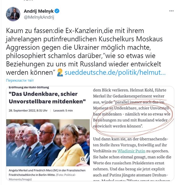 До слова, ця заява викликала різку реакцію колишнього посла України у ФРН Андрія Мельника, який у Twitter поставив смайлик фей-спалму і написав: "У це важко повірити: екс-канцлер, який уможливив агресію Москви проти українців своїм багаторічним путінським затишком, безсоромний про те, "як можна буде знову розвивати з Росією щось на зразок відносин".