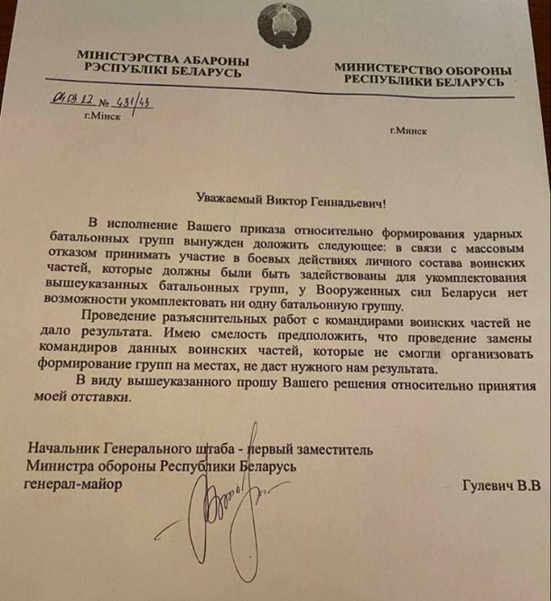 "Ті, хто надіслав мені цей документ, кажуть, що він справжній. Начальник Генштабу Білорусі подав у відставку. Воювати з Україною не хоче. Але, вважаю, треба було думати раніше, перш ніж планували війну, а не після того, як її разом із Путіним розпочали", – написав Цаплієнко.