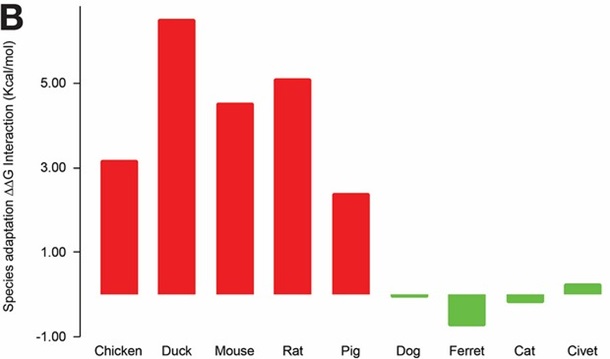 Помимо сродства был проверен индекс адаптации кодонов у различных видов: показатель, насколько эффективно вирус "порабощает" механизмы клетки после проникновения в нее и использует ее для создания белков, нужных ему для репликации (размножения). Выяснилось, что наивысшая адаптация кодонов к SARS-CoV-2 у людей, кур и уток, тогда как другие виды адаптированы хуже.
