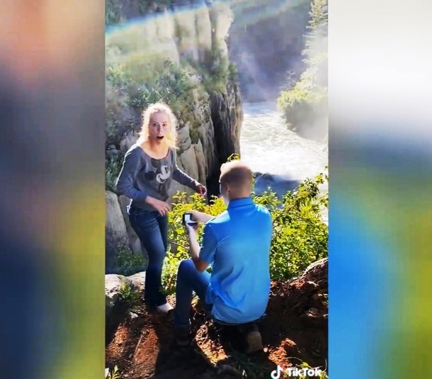 На кадрах он встает перед растерявшейся любимой на одно колено и протягивает ей коробочку. Потом парень делает неловкое движение и коробочка летит в пропасть.