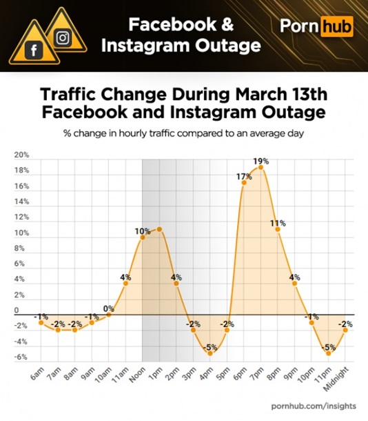 Pornhub опубликовал статистику, согласно которой количество зрителей видео для взрослых выросло на 19% от среднего во время отключения Facebook и Instagram. Скачок трафика произошел как раз в период сбоя - 13 марта около 19:00.
