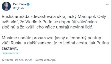 Прем'єр-міністр Чехії Петр Фіала назвав президента РФ Володимира Путіна військовим злочинцем і закликав країни світу посилити антиросійські санкції. Про це 21 березня глава чеського уряду написав у Twitter.