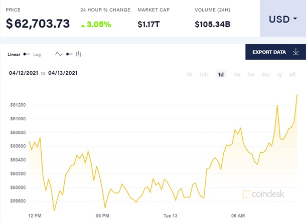 Найпопулярніша криптовалюта біткоїн відновила зростання. Її вартість вперше в історії перевищила рубіж у 62 тисячі доларів. Про це свідчать дані CoinDesk у вівторок, 13 квітня.