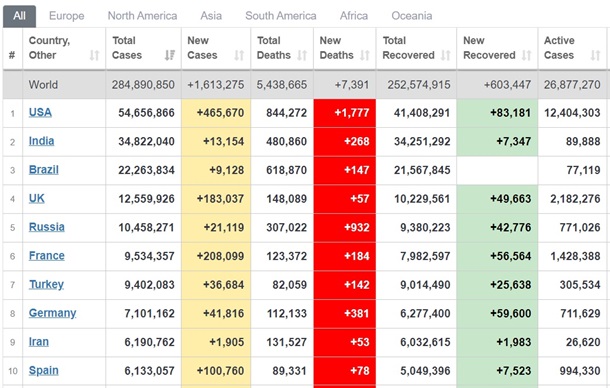 За весь час пандемії кількість інфікованих становить майже 285 млн людей. З них одужали понад 252 млн. Зараз налічується близько 27 млн активних випадків захворювання.