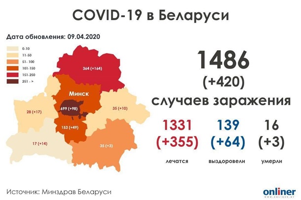 В Беларуси за сутки зарагестрировано сразу 420 новых случаев коронавируса, в целом стране 1486 случаев COVID-19, 16 смертельных. Об этом сообщил Минздрав Беларуси в четверг, 9 апреля.