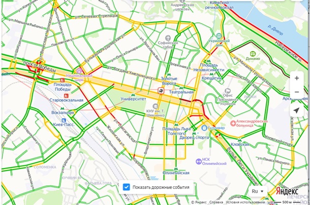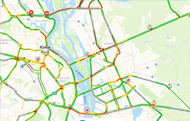 Наиболее критическая ситуация на подъездах к мостам, связывающим левый берег столицы с правым. Автомобили стоят на Северном и Южном мостах и на подъездах к ним, а также в районе станции метро Гидропарк.