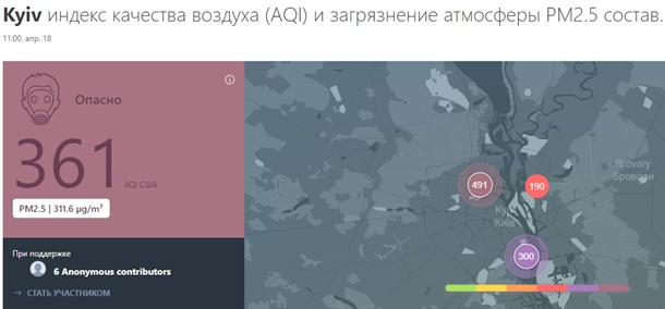 Так, по состоянию на 11:30 индекс загрязнения воздуха в столице Украины составлял рекордный на этой неделе 361 балл при норме 50. Это опасный уровень. При этом вчера утром загрязнение оценивалось в 338 баллов.