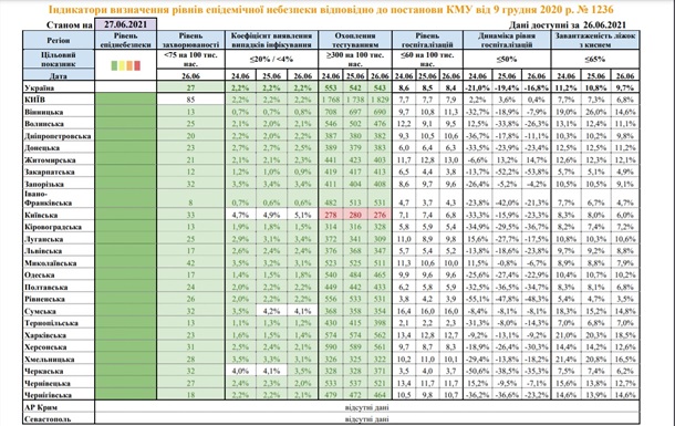 Київська область за одним з показників відповідає "червоній" зоні карантину. Про це свідчать дані Міністерства охорони здоров'я в неділю, 27 червня.
