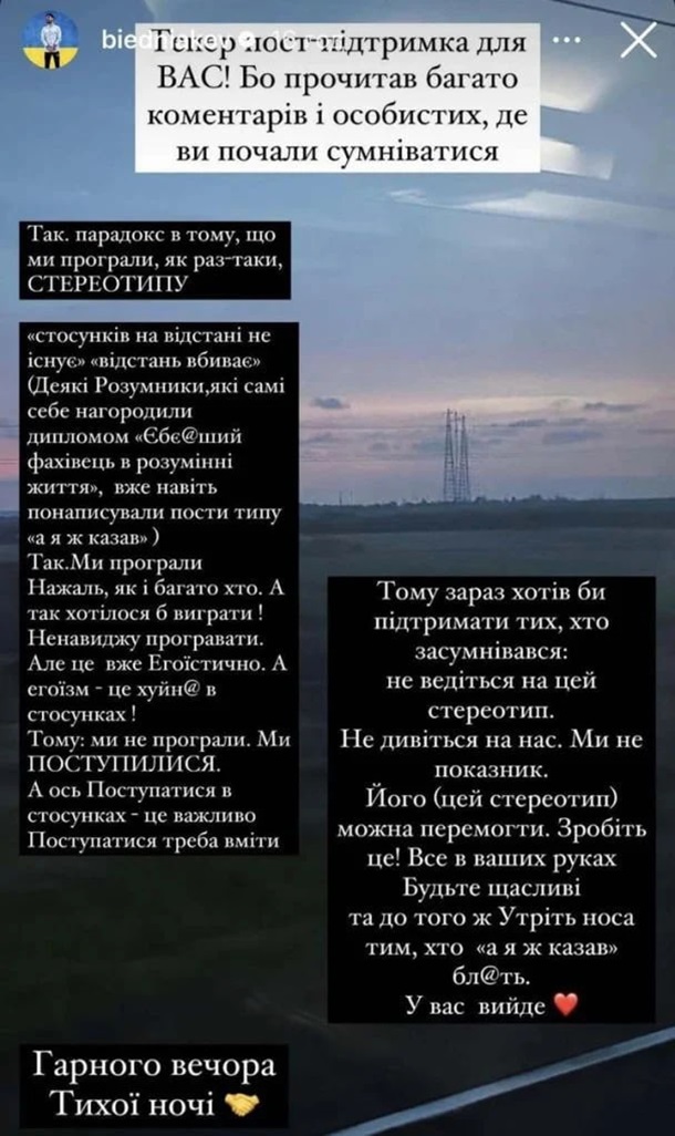 "Мы проиграли именно стереотипу "отношений на расстоянии не существует" и "расстояние убивает". Мы проиграли, к сожалению, как и многие. А так хотелось бы выиграть! Ненавижу проигрывать, но это уже эгоистично, а эгоизм - это х**ня в отношениях! Поэтому мы не проиграли, а уступить в отношениях - это важно. Уступать надо уметь!", - написал он.